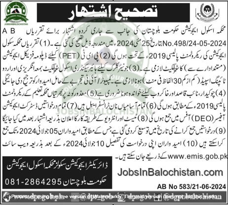 The following has been corrected in the advertisement for appointments AB 498/24-05-2024.No dated 25 May 2024 issued by the Department of School Education, Government of Balochistan.