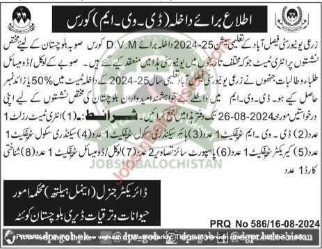 The University of Agriculture Faisalabad has announced admissions for the Doctor of Veterinary Medicine (DVM) program for the 2024-25 academic session. This is a golden opportunity for students from Balochistan to secure a place in one of the top veterinary programs in the country.