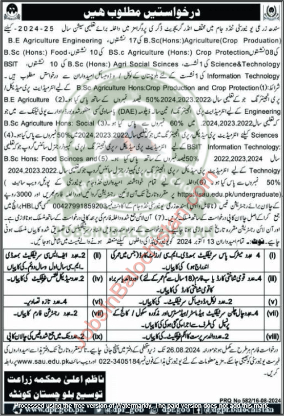 Applications are invited for admission to various undergraduate programs for the academic session 2024-25 at Sindh Agriculture University, Tandojam. The available programs are: