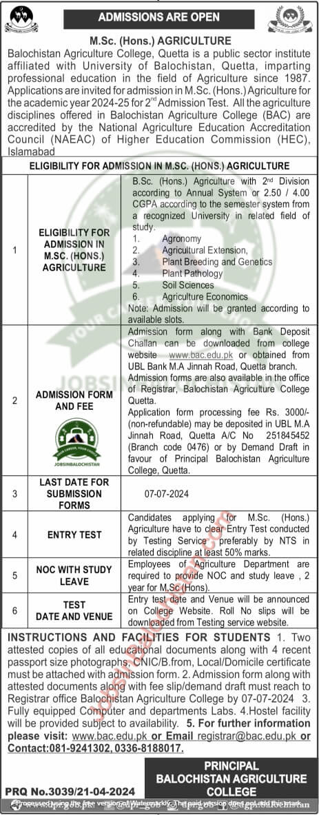 - Admission form along with attested documents along with fee slip/demand draft must reach to Registrar office Balochistan Agriculture College by 07-07-2024Â