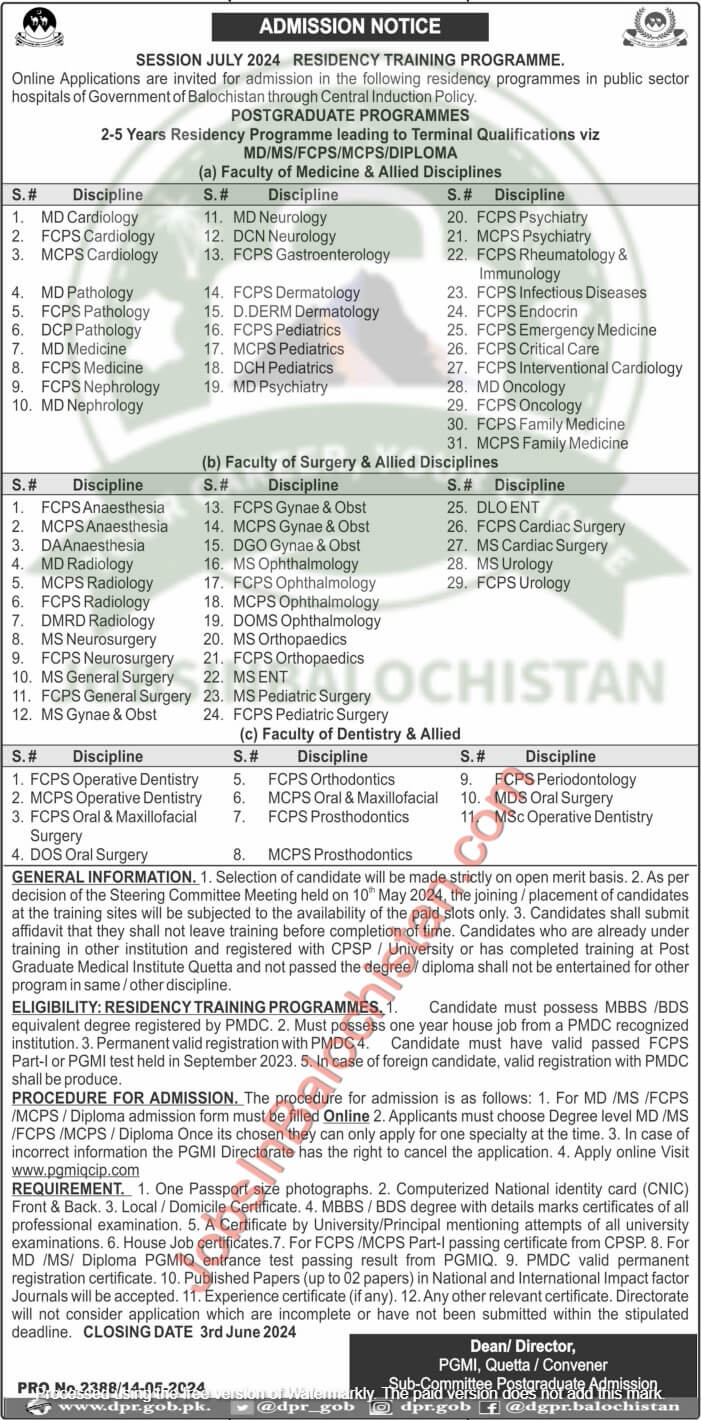 SESSION JULY 2024 RESIDENCY TRAINING PROGRAMME. Online Applications are invited for admission in the following residency programmes in public sector hospitals of Government of Balochistan through Central Induction Policy. POSTGRADUATE PROGRAMMES 2-5 Years Residency Programme leading to Terminal Qualifications viz MD/MS/FCPS/MCPS/DIPLOMA (a) Faculty of Medicine & Allied Disciplines.