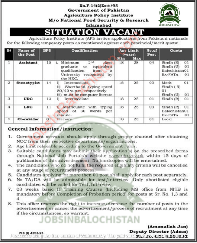 Agriculture Policy Institute (API) invites applications from Pakistani nationals for the following temporary posts as mentioned against each provincial/merit quota: Agriculture Policy Institute Islamabad jobs in Balochistan. The vacancies have been announced in Balochistan through the Jang Newspaper. The hiring process will follow departmental guidelines. Candidates from Balochistan who satisfy the requirements can now apply for the vacancies that are listed in the advertisement below. After the recruitment process is complete, eligible applicants can apply using the organization’s established procedure and receive these Jobs in Balochistan in 2024