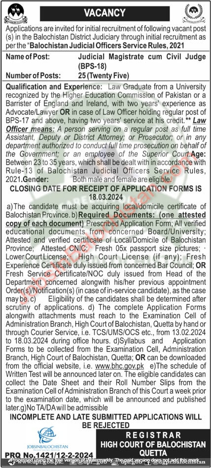Applications are invited for initial recruitment of following vacant post (s) in the Balochistan District Judiciary through initial recruitment as per the “Balochistan Judicial Officers Service Rules, 2021