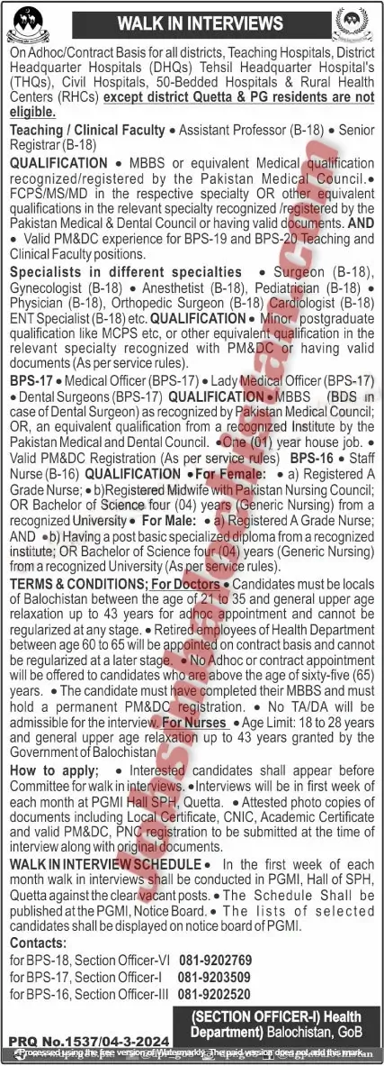 - Â For Doctors Candidates must be locals of Balochistan between the age of 21 to 35 and general upper age relaxation up to 43 years for adhoc appointment and cannot be regularized at any stage. Retired employees of Health Department between age 60 to 65 will be appointed on contract basis and cannot be regularized at a later stage. No Adhoc or contract appointment will be offered to candidates who are above the age of sixty-five (65) years. The candidate must have completed their MBBS and must hold a permanent PM&DC registration. No TA/DA will be admissible for the interview. For Nurses Age Limit: 18 to 28 years and general upper age relaxation up to 43 years granted by the Government of Balochistan