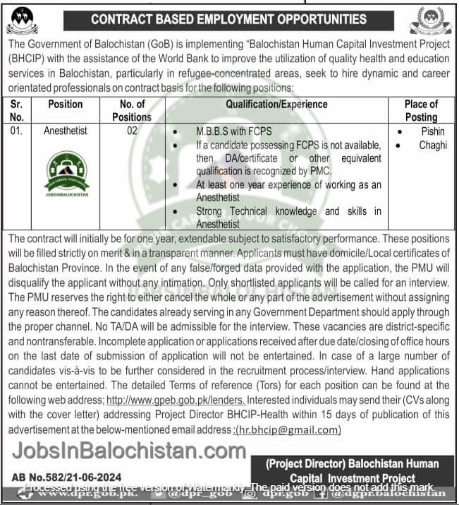 The Government of Balochistan (GoB) is implementing “Balochistan Human Capital Investment Project (BHCIP) with the assistance of the World Bank to improve the utilization of quality health and education services in Balochistan, particularly in refugee-concentrated areas, seek to hire dynamic and career orientated professionals on contract basis for the following positions: