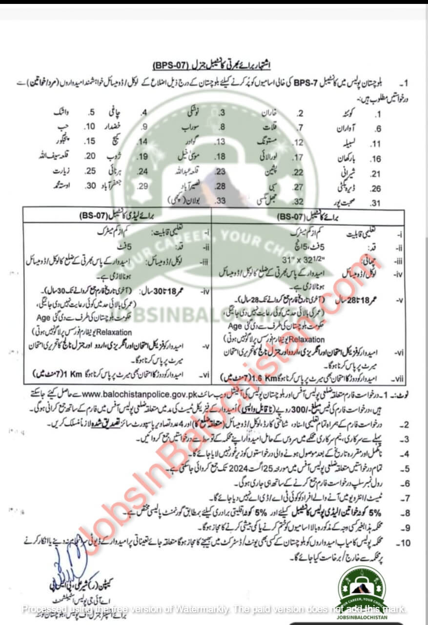 - لوٹ :- 1- درخواست فارم متعلقہ ضلعی پولیس آفس اور بلوچستان پولیس کی آفیشل ویب سائٹ www.balochistanpolice.gov.pk سے حاصل کیئے جاسکتے ہیں، درخواست فارم کی فیس مبلغ 300 روپے (ناقابل واپسی ) اُمیدوار کے نیز یکل ٹیسٹ کی مد میں متعلقہ ضلعی پولیس آفس میں فارم کے ساتھ جمع کرانی ہو گی۔
