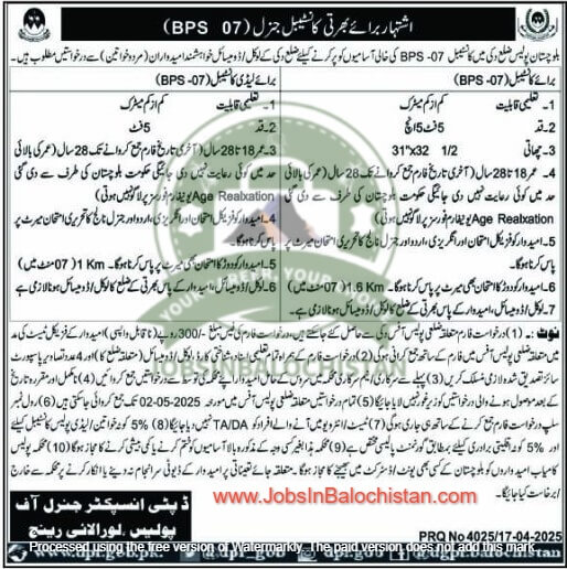 Balochistan Police Constable District Dukki Jobs 2025