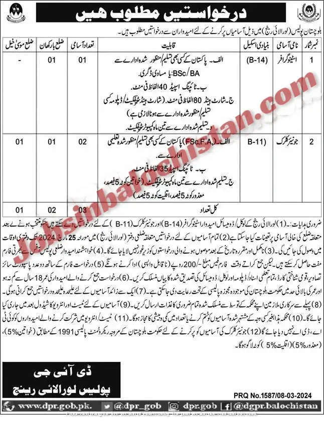 - لورالائی رینج کے لوکل / ڈومیسائل امید وار اسٹینوگرافر اور جونیئر کلرک کے لئے درخواستیں دے سکتے ہیں جنکو منتخب ہونے کے بعد متعلقہ ضلع کی خالی آسامی پر تعینات کیا جا سکتا ہے (2) تمام آسامیوں کے لئے درخواستیں متعلقہ ضلعی دفتر ( لورالائی رینج) میں مورخہ 25 مارچ 2024 تک دفتری اوقات