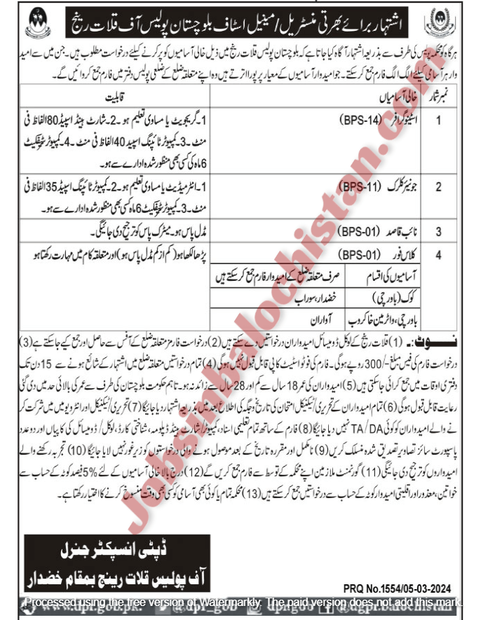(1) قلات رینج کے لوکل ڈومیسائل امیدواران درخواستیں دے سکتے ہیں (2) درخواست فارمز متعلقہ ضلع کے آفس سے حاصل اور جمع کیے جاسکتے ہے (3) درخواست فارم کی فیس مبلغ 300 روپے ہوگی ۔ فارم کی فوٹو اسٹیٹ کاپی قابل قبول نہیں ہوگی (4) تمام درخواستیں متعلقہ ضلع میں اشتہار کے شائع ہونے سے 15 دن تک دفتری اوقات میں جمع کرائی جاسکتی ہیں (5) امیدواران کی عمر 18 سال سے کم اور 28 سال سے زائد نہ ہو۔ تاہم حکومت بلوچستان کی طرف سے عمر کی بالائی حد میں دی گئی رعایت قابل قبول ہوگی (6) تمام امیدواران کے تحریری ٹیکنیکل امتحان کی تاریخ و جگہ کی اطلاع بعد میں بذریعہ اشتہار دیا جائیگا (7) تحریری ٹیکنیکل اور انٹرویو میں میں شرکت کر نے والے امیدواران کو کوئی TA / DA نہیں دیا جائیگا (8) فارم کے ساتھ تمام تعلیمی اسنا، کمپیوٹر شارٹ ہینڈ ڈپلومہ، شناختی کارڈ، لوکل / ڈومیسائل کی کا پیاں اور دو عدد پاسپورٹ سائز تصاویر تصدیق شدہ منسلک کریں (9) نامکمل اور مقررہ تاریخ کے بعد موصول ہونے والی درخواستوں کو زیر غور نہیں لایا جائیگا (10) تجربہ رکھنے والے امیدواروں کو ترجیح دی جائیگی (11) گورنمنٹ ملازمین اپنے محکمہ کے توسط سے فارم جمع کریں گے (12) درج بالا خالی آسامیوں کے لئے %5 فیصد کوٹہ کے حساب سے خواتین، معذور اور اقلیتی امید وار کوٹہ کے حساب سے درخواستیں جمع کر سکتے ہیں (13) محکمہ تمام یا کوئی بھی آسامی کوکسی بھی وقت منسوخ کرنے کا اختیار رکھتا ہے۔