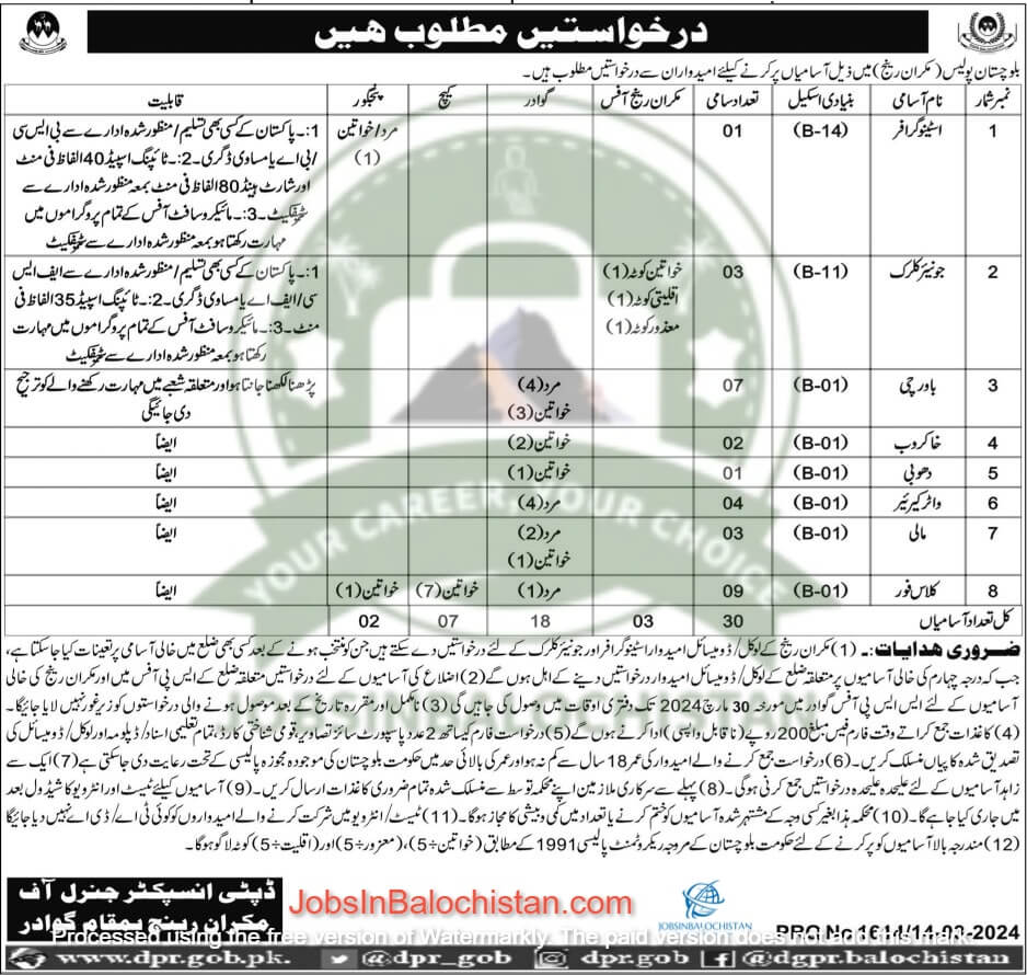 ضروری هدایات:۔ (1) مکران رینج کے لوکل / ڈومیسائل امیدوار اسٹینو گرافر اور جونیئر کلرک کے لئے درخواستیں دے سکتے ہیں جن کو منتخب ہونے کے بعد کسی بھی ضلع میں خالی آسامی پر تعینات کیا جا سکتا ہے، جب کہ درجہ چہارم کی خالی آسامیوں پر متعلقہ ضلع کے لوکل / ڈومیسائل امیدوار درخواستیں دینے کے اہل ہوں گے (2) اضلاع کی آسامیوں کے لئے درخواستیں متعلقہ ضلع کے ایس پی آفس میں اور مکران رینج کی خالی آسامیوں کے لئے ایس ایس پی آفس گوادر میں مورخہ 30 مارچ 2024 تک دفتری اوقات میں وصول کی جائیں گی (3) نامکمل اور مقررہ تاریخ کے بعد موصول ہونے والی درخواستوں کو زیر غور نہیں لایا جائیگا۔ (4) کا غذات جمع کراتے وقت فارم فیس مبلغ 200 روپے ( نا قابل واپسی ) ادا کرنے ہوں گے (5) درخواست فارم کیسا تھ 2 عدد پاسپورٹ سائز تصاویر، قومی شناختی کارڈ، تمام تعلیمی اسناد/ ڈپلومہ اور لوکل / ڈومیسائل کی تصدیق شدہ کا پیاں منسلک کریں۔ (6) درخواست جمع کرنے والے امیدوار کی عمر 18 سال سے کم نہ ہو اور عمر کی بالائی حد میں حکومت بلوچستان کی موجودہ مجوزہ پالیسی کے تحت رعایت دی جاسکتی ہے (7) ایک سے زاہد آسامیوں کے لئے علیحدہ علیحدہ درخواستیں جمع کرنی ہوگی ۔ (8) پہلے سے سرکاری ملازمین اپنے محکمہ تو سط سے منسلک شدہ تمام ضروری کا غذات ارسال کریں ۔ (9) آسامیوں کیلئے ٹیسٹ اور انٹرویو کا شیڈول بعد میں جاری کیا جائے گا ۔ (10) محکمہ ہذا بغیر کسی وجہ کے مشتہر شدہ آسامیوں کو ختم کرنے یا تعداد میں کمی و بیشی کا مجاز ہوگا ۔ (11) ٹیسٹ / انٹرویو میں شرکت کرنے والے امیدواروں کو کوئی ٹی اے ڈی اے نہیں دیا جائیگا (12) مندرجہ بالا آسامیوں کو پر کرنے کے لئے حکومت بلوچستان کے مروجہ ریکروٹمنٹ پالیسی 1991 کے مطابق (خواتین 5 ) ، ( معزور : 5 ) اور (اقلیت : 5 ) کوٹہ لاگو ہوگا۔