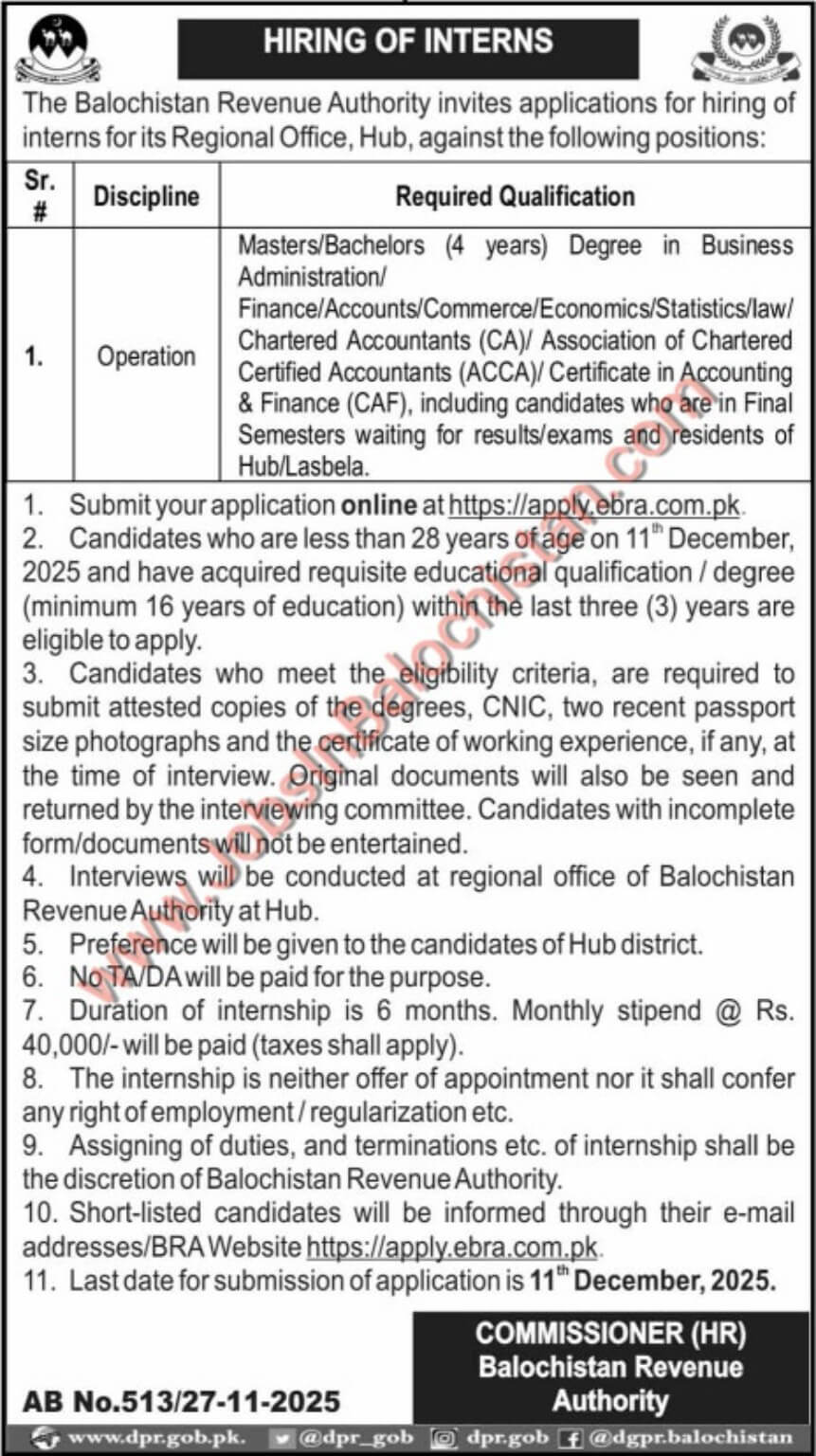 Balochistan Revenue Authority internship porgram 2025 - apply online regional office hub