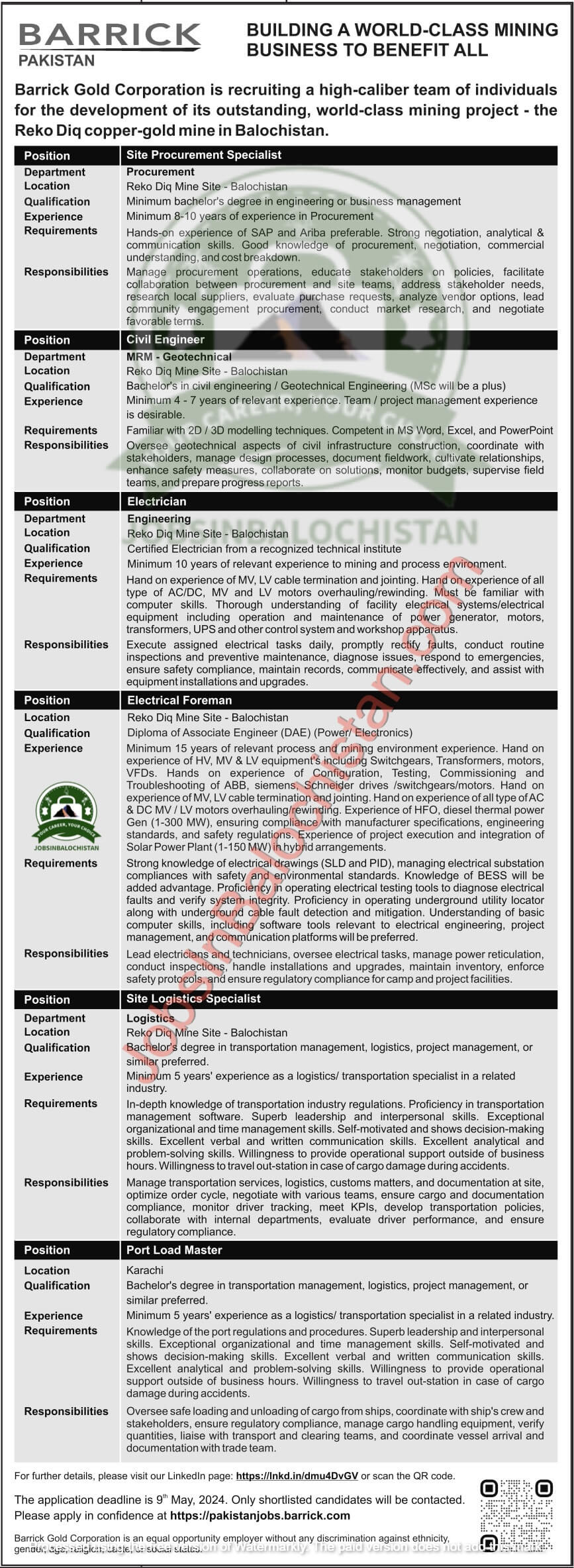 - The application deadline is May 09, 2024. Only shortlisted candidates will be contacted. Please apply in confidence at https://pakistanjobs.barrick.com/