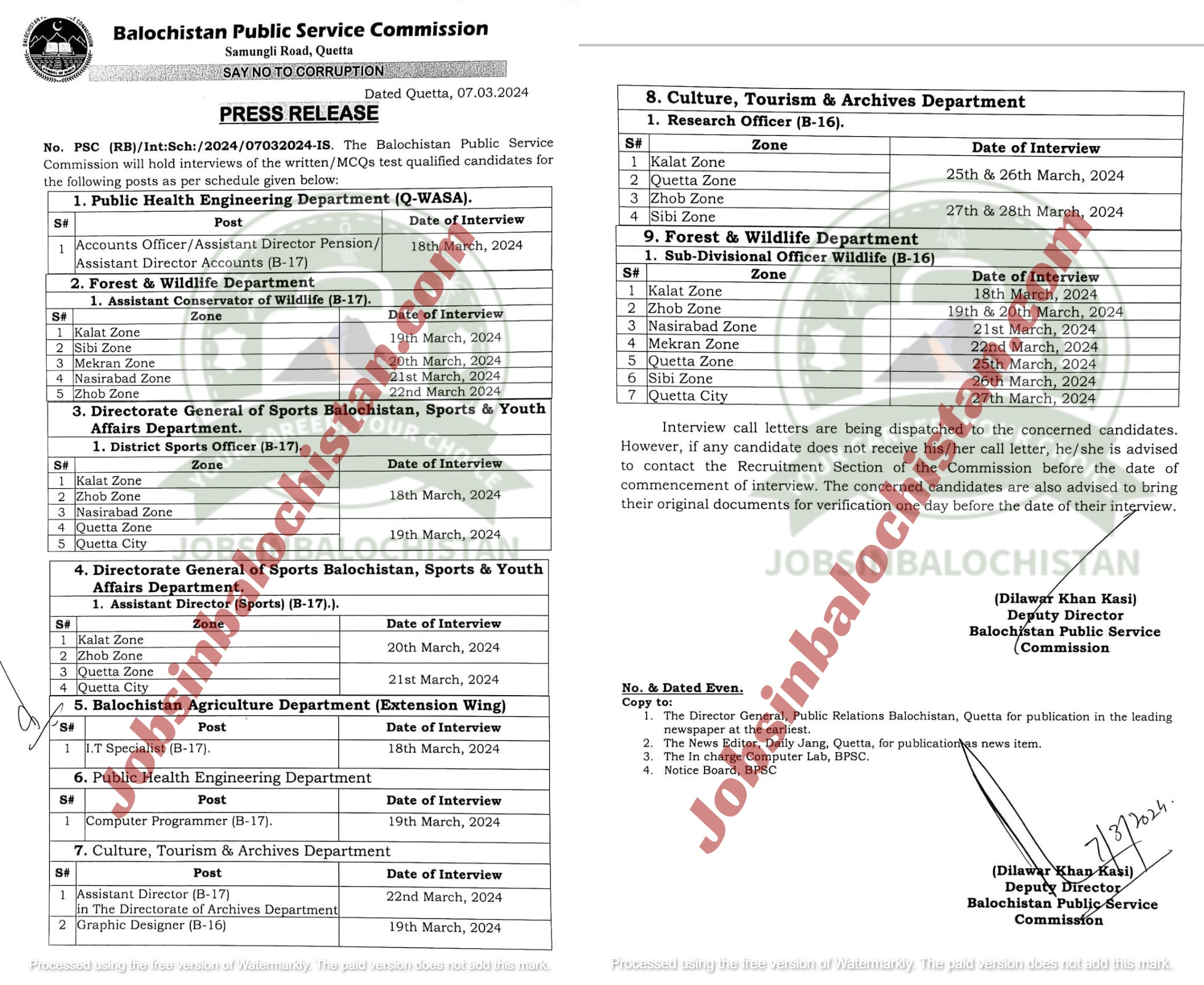 PSC (RB)/Int:Sch: /2024/07032024-IS. The Balochistan Public Service Commission will hold interviews of the written/MCQs test qualified candidates for the following posts as per schedule given below:
