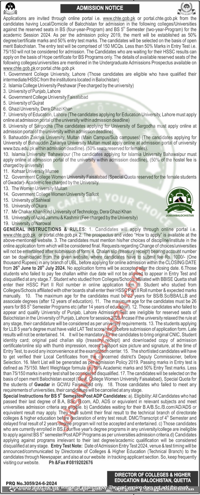 Don’t miss out on this opportunity to pursue your higher education at some of Pakistan’s top universities. Apply now for the 2024 BS admissions under the reserved seats for Balochistan students. For more details and to apply, visit www.chte.gob.pk.