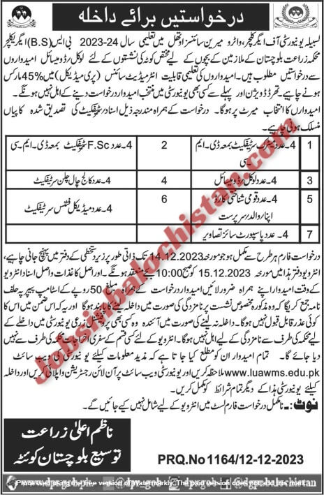 درخواست فارم ہر طرح سے مکمل ہو جو مورخہ 14.12.2023 تک ذاتی طور پر زیر دستخطی کے دفتر میں پہنچ جانی چاہیے، انٹرویو دفتر ہذا میں مورخہ 15.12.2023 کو صبح 10:00 بجے منعقد ہونگے ۔ اور اصل کا غذات واصل اسناد انٹرویو کے وقت امیدوار اپنے ہمراہ ضرور لائیں امیدوار درخواست کے ہمراہ مبلغ 50 روپے کے اسٹامپ پیپر پر حلف نامہ جمع کریگا کہ وہ مذکورہ مخصوص نشست پر نامزدگی کی صورت میں داخلہ لینے کا پابند ہوگا اور یہ کہ اس ضمن میں اس کا کوئی عذر قابل قبول نہیں ہو گا۔ داخلہ نہ لینے کی صورت میں آئندہ وہ کسی بھی پروفیشنل زرعی یونیورسٹی میں داخلے کے لیے محکمہ کی طرف سے نامزدگی کے لیے اہل نہیں ہوگا۔ انٹرویو کے لئے کسی قسم کے سفری اخراجات محکمہ کی طرف سے نہیں دیا جائے گا۔ تمام امیدوار ان کو مطلع کیا جاتا ہے کہ مزید معلومات کیلئے یو نیورسٹی کی ویب سائٹ www.luawms.edu.pk ملاحظہ کریں اور یونیورسٹی ویب سائٹ پر آن لائن رجسٹریشن و اپلائی کریں اور داخلہ کیلئے یونیورسٹی ہذا کے دیگر تمام شرائط کو مکمل کریں۔ نوٹ : نامکمل درخواست فارم لسٹ میں انٹرویو کے لیے شامل نہیں کیے جائیں گے۔