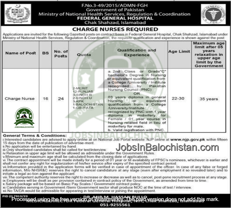 Charge Nurse Jobs In Federal General Hospital Islamabad 2024