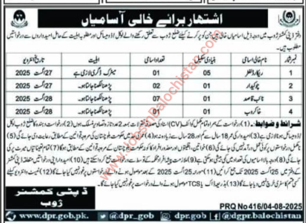 Deputy Commissioner DC office district Zhob Balochistan jobs for 2025. These vacancies have been published in the Local Newspaper and are open to eligible candidates from Balochistan. The hiring process will adhere to departmental policies to ensure fairness and transparency. If you meet the eligibility criteria, you can apply for the positions listed in the advertisement below.