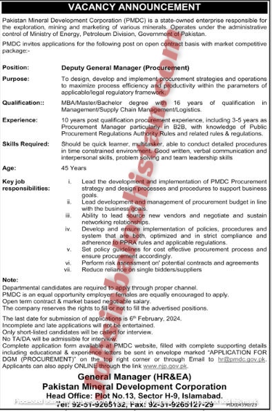 Complete application form available at PMDC website, filled with complete supporting details including educational & experience letters be sent in envelope marked “APPLICATION FOR DGM (PROCUREMENT)” on the top right corner or through Email to [email protected]. Applicants can also apply ONLINE.