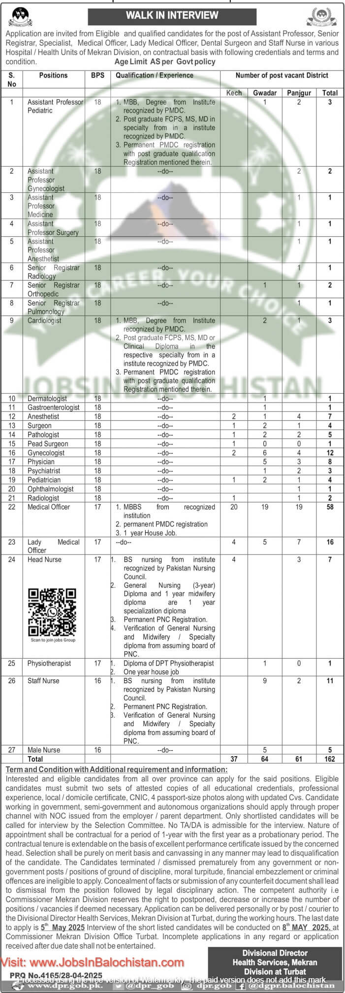 - Applications must be submitted to the Divisional Director Health Services, Turbat Division before 05 May 2025.