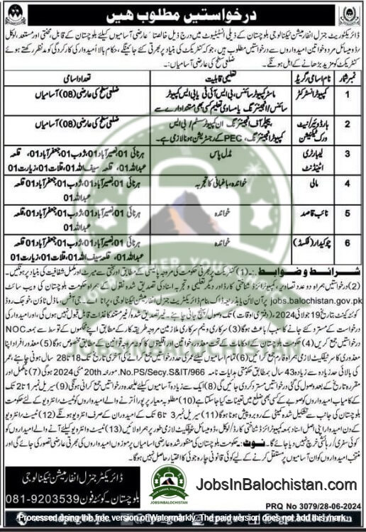 - Applications along with two photographs, computerized identity card and attested copies of other educational and experience certificates and the website of the Government of Balochistan. Online at jobs.balochistan.gov.pk or by post to Directorate General Information Technology, Old A. G Office, Model Town, Khojak Road Quetta Cantt should be received/reached by 19 July 2024 (office hours). Diets of unverified / unauthenticated will not be acceptable, and of the candidate The reason for rejection of the application will beÂ