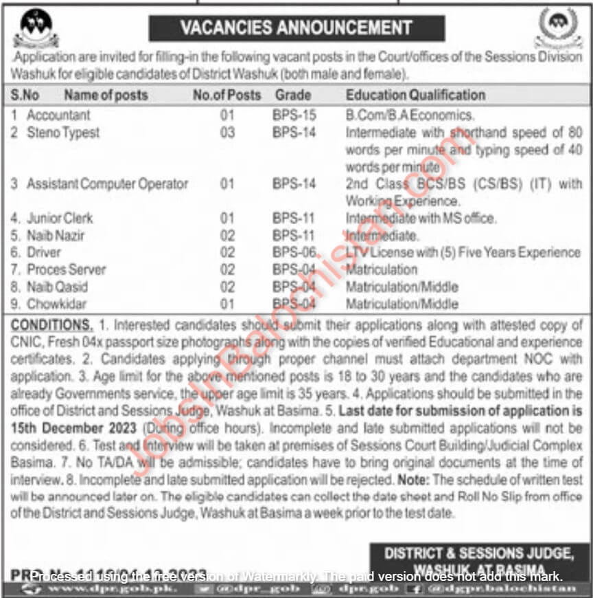 - Applications should be submitted in the office of District and Sessions Judge, Washuk at Basima.