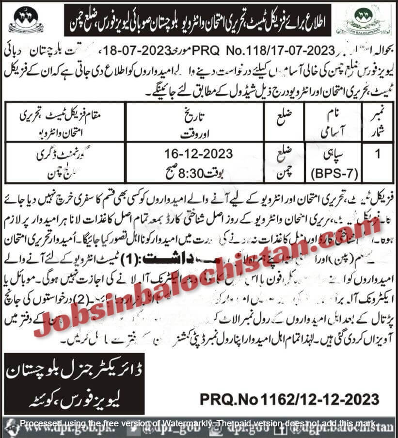 District Chaman | Balochistan Levies Force Tests & Interview 2023