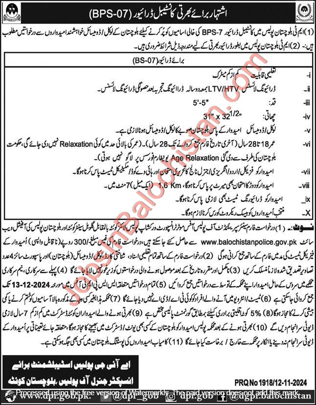 - Applicant should submit their applications for the post of Balochistan Police MT section as a Driver (Constable) before the deadline 13 December 2024
