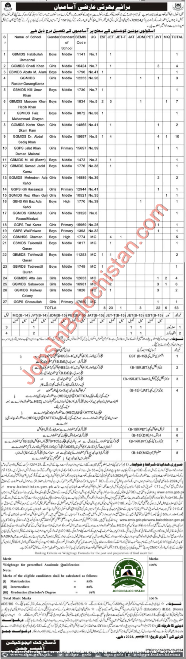 The Education Department of Quetta Division District Chaman, Balochistan, invites applications for various teaching posts in schools across the district. These posts are temporary, and candidates from Gwadar are encouraged to apply. Applicants must meet the required educational qualifications and eligibility criteria to be considered for these roles.