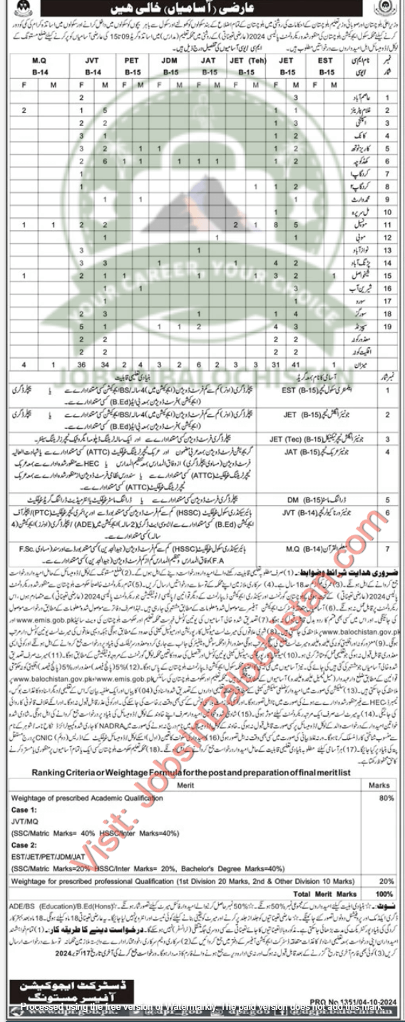 Submit applications along with all required documents to the District Education Officer, Mastung, by 17th October 2024.