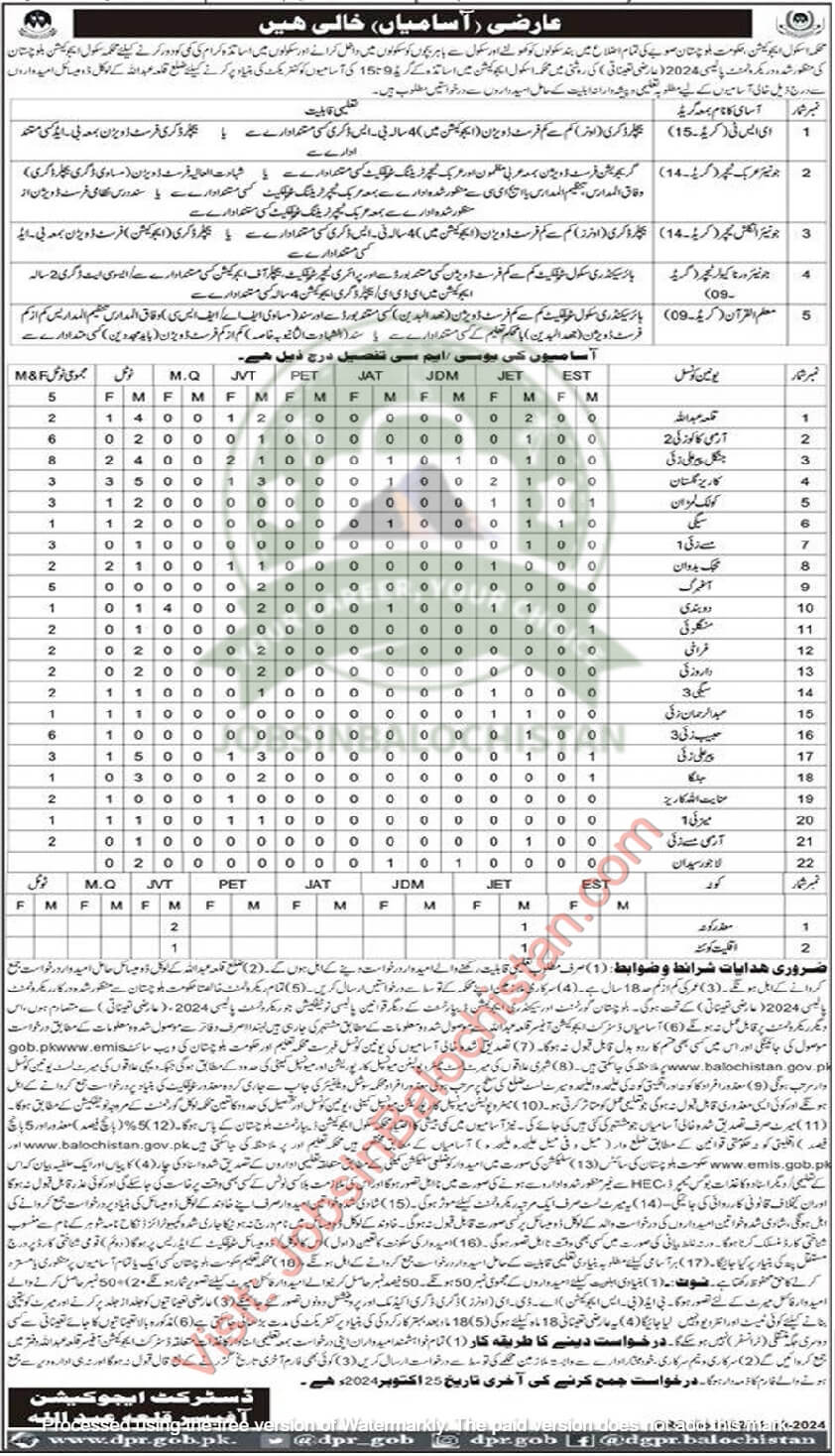 The Education Department of District Killa Abdullah, Balochistan, invites applications for various teaching posts in schools across the district. These posts are temporary, and candidates from Gwadar are encouraged to apply. Applicants must meet the required educational qualifications and eligibility criteria to be considered for these roles.