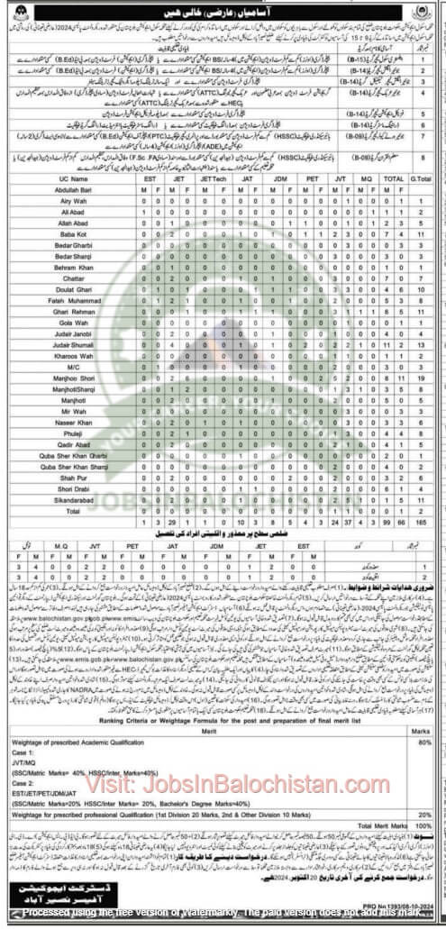 Submit applications along with all required documents to the District Education Officer, Naseerabad, by 20 October 2024.