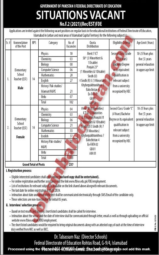 Elementary School Teacher (EST) Jobs 2024 in Directorate of Federal Education