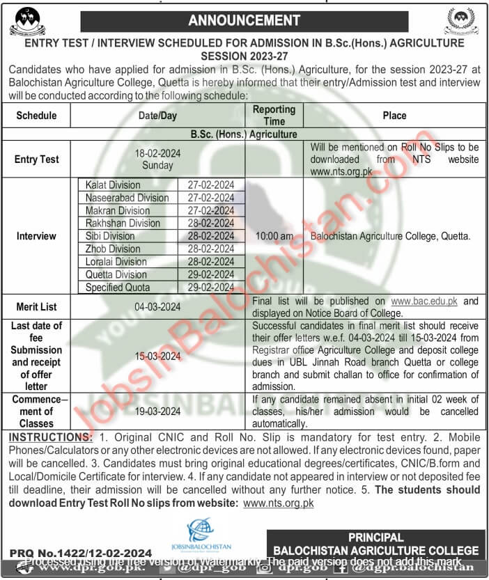 Candidates who have applied for admission in B.Sc. (Hons.) Agriculture, for the session 2023-27 at Balochistan Agriculture College, Quetta is hereby informed that their entry/Admission test and interview will be conducted according to the following schedule: