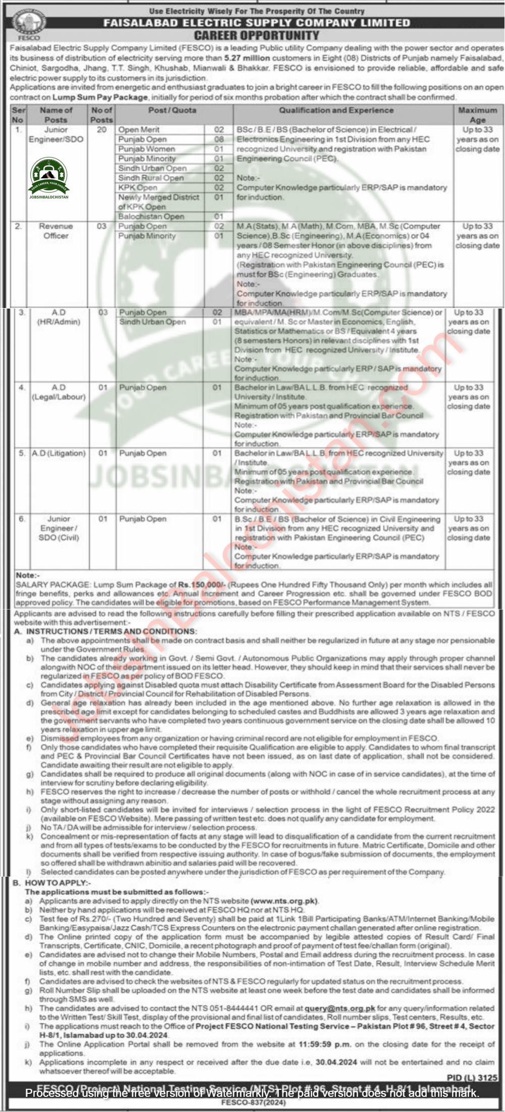 - The applications must reach to the Office of Project FESCO National Testing Service-Pakistan Plot #96, Street #4, Sector H-8/1, Islamabad up to 30.04.2024.