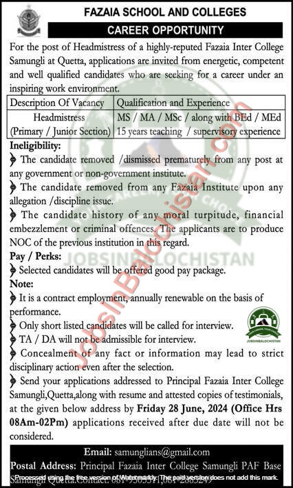 Send your applications addressed to Principal Fazaia Inter College Samungli, Quetta, along with resume and attested copies of testimonials, at the given below address by Friday 28 June, 2024 (Office Hrs 08Am-02Pm) applications received after due date will not be considered.