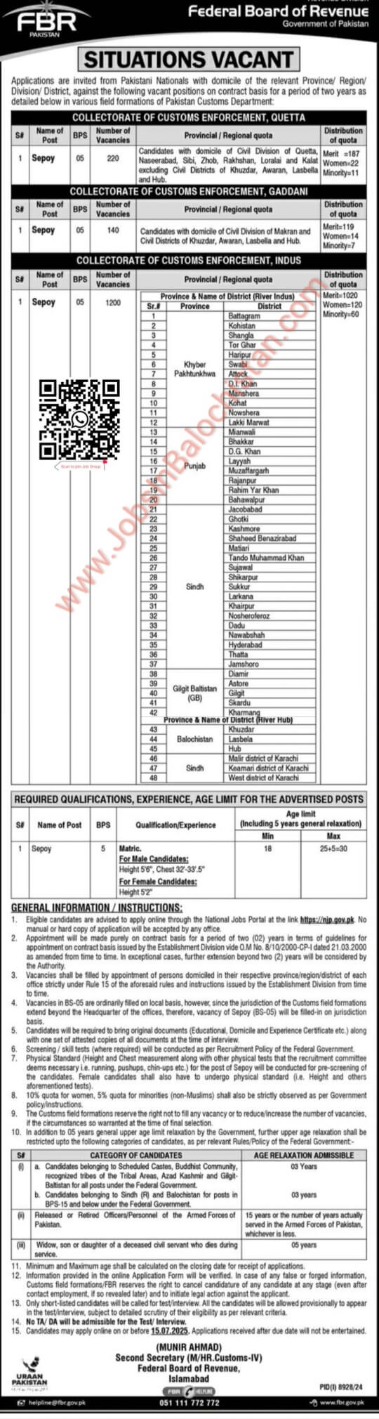 Federal Board of Revenue FBR Customs Department announced new jobs 2025. The vacancies have been announced in Balochistan through the Mashriq Newspaper. The hiring process will follow departmental guidelines. Candidates from Balochistan who satisfy the requirements can now apply for the vacancies that are listed in the advertisement. https://balochistanjobs.com/ https://pk.indeed.com/l-balochistan-jobs.html