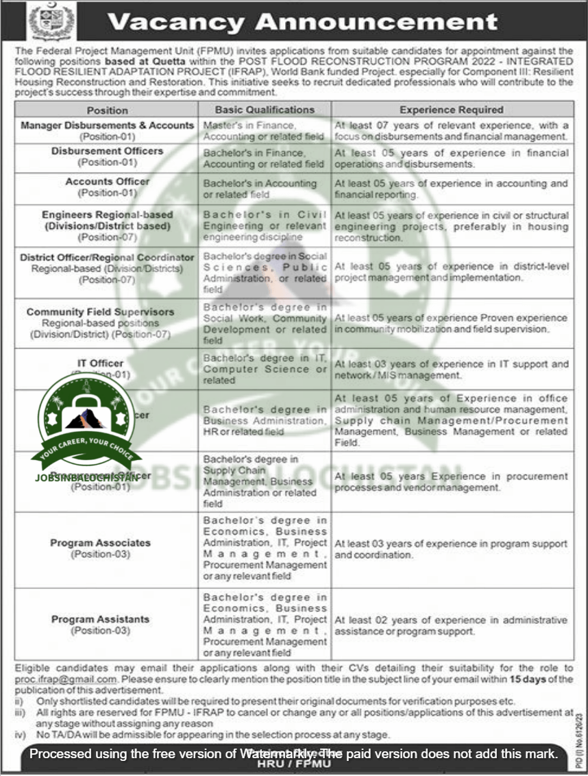 The Federal Project Management Unit (FPMU) invites applications from suitable candidates for appointment against the following positions based at Quetta within the POST FLOOD RECONSTRUCTION PROGRAM 2022-INTEGRATED FLOOD RESILIENT ADAPTATION PROJECT (IFRAP), World Bank funded Project, especially for Component III: Resilient Housing Reconstruction and Restoration. This initiative seeks to recruit dedicated professionals who will contribute to the project’s success through their expertise and commitment.