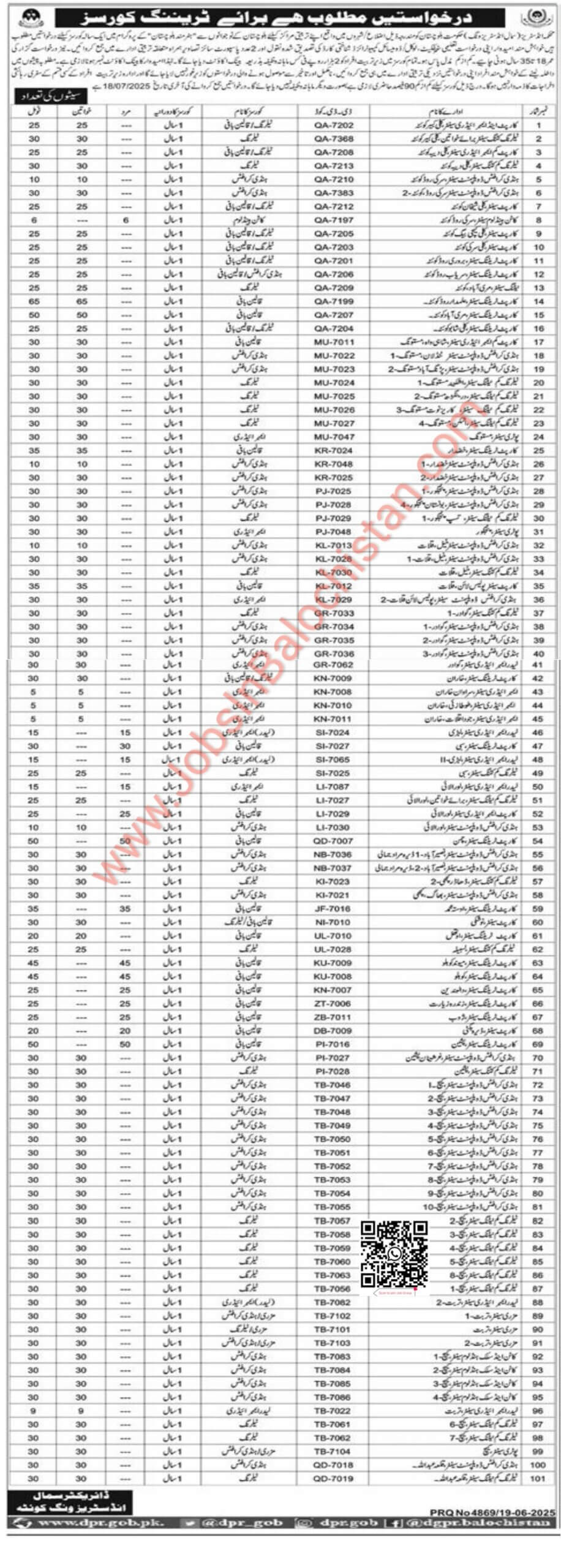 Industries Department (Small Industries Wing), Government of Balochistan, invites applications from the youth of Balochistan free training courses for one-year courses under the program (Hunarmand Balochistan) for its training center located in the following districts/cities.
