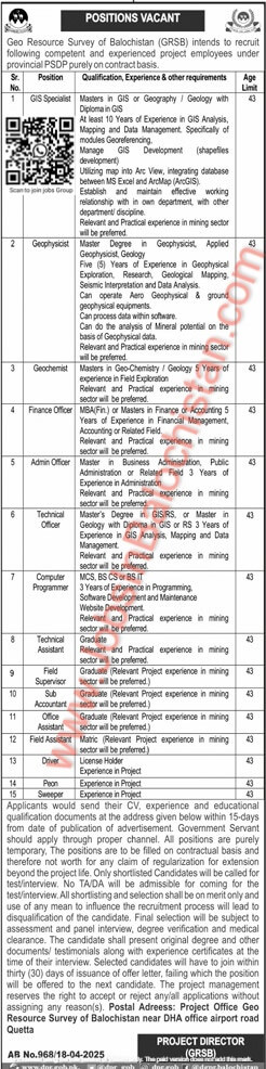 Geo Resources Survey announced new Balochistan jobs for 2025. These vacancies have been published in the Jang Newspaper and are open to eligible candidates from Baloc histan. The hiring process will adhere to departmental policies to ensure fairness and transparency. If you meet the eligibility criteria, you can apply for the positions listed in the advertisement below.