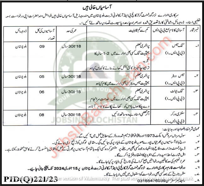 Government institutions near Government Girls College B & Arkaloni Tarbat Balochistan have the following vacancies. Interested persons should bring their application along with educational certificates, domicile, identity card attested and along with four passport photos.