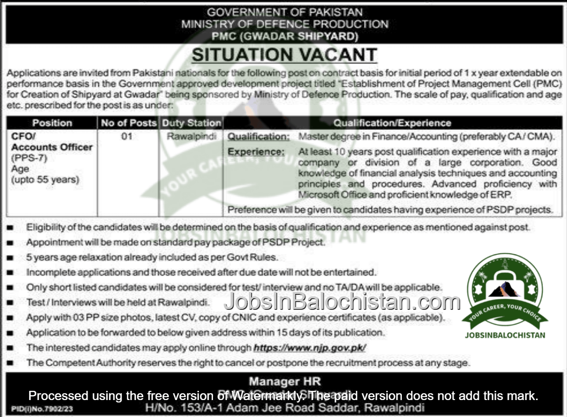 Applications are invited from Pakistani nationals for the following post on contract basis for initial period of 1 x year extendable on performance basis in the Government approved development project titled “Establishment of Project Management Cell (PMC) for Creation of Shipyard at Gwadar” being sponsored by Ministry of Defence Production. The scale of pay, qualification and age etc. prescribed for the post is as under: