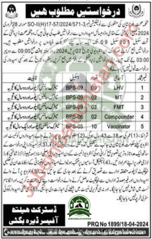 Notification No. 3-57/2024/571-17 1-0 dated 28th February 2024 with the approval of Department of Health, Balochistan, applications are invited from local two and missile candidates of District Dera Balti to apply for scale 201 scale under Department of Health, Dera Patti. 09 Applications are invited on contract basis for a period of one year.