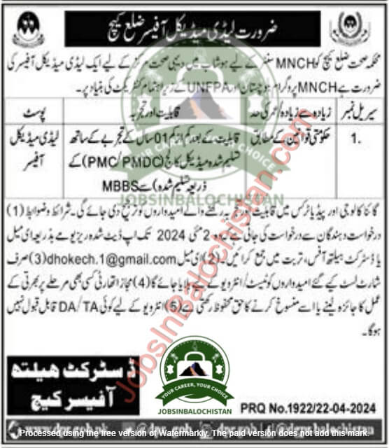 Department of Health District Kech requires a Lady Medical Officer for Rural Health Center at Ho Shab for MNCH Center under MNCH Program Balochistan and UNFPA sponsored contract basis.