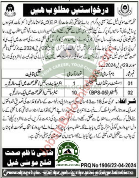 Applications are invited from candidates belonging to District Musa khail to fill up the menial vacancies on purely temporary (contract) basis in Extended Program for Immunization (EPI) of Musakhel Health Department. The appointment period will be for one year (in case the performance of the recruited candidate is not satisfactory, he/she will be relieved from the duty once.