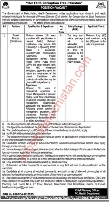 Government of Balochistan, Health Department, Naseerabad City, Balochistan, announced new jobs for 2025. These vacancies have been published in the Local Newspaper and are open to eligible candidates from Balochistan. The hiring process will adhere to departmental policies to ensure fairness and transparency. If you meet the eligibility criteria, you can apply for the positions listed in the advertisement below.