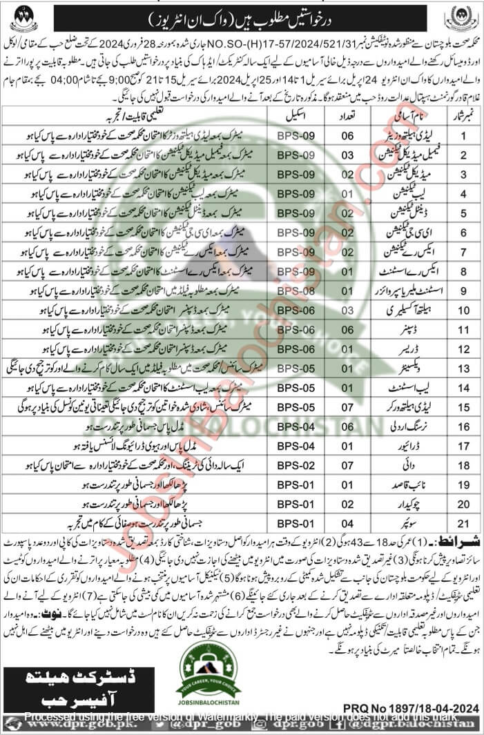 Under Balochistan Health Department approved Notification No. 572024/521/31-17-NO SO issued on 28th February 2024 for the following vacancies from candidates having local local and domicile of district Hub on one year contract ad hoc basis. Applications are invited.