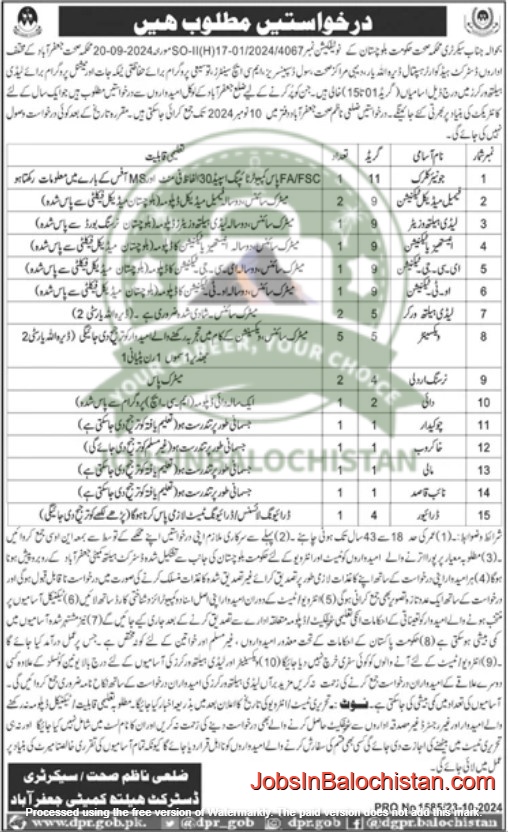 1. Submit your applications to the District Health office in Jafarabad by November 10, 2024. Interviews will follow the timetable provided by the Deputy Commissioner’s office.