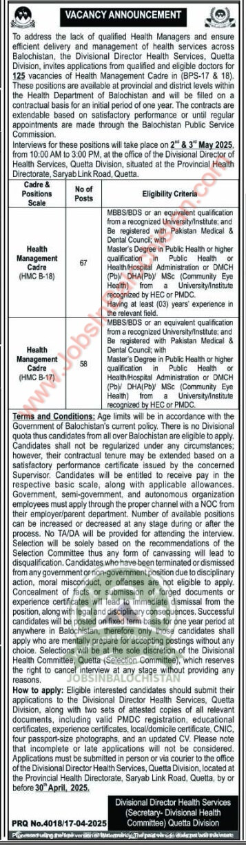 - Applications must be submitted to the Divisional Director Health Services, Quetta Division before 30 april 2025.