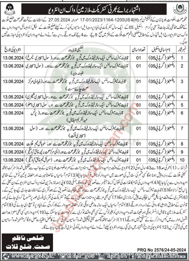 According to the orders of the Health Department, Government of Balochistan Notification No. (1200-23/1164 01/20-17 dated 27.05.2024) various protective vaccinations of the Health Department of District Kalat on the basis of one year contract of Program Scale 05. To fill up the vacancies, the walk-in interview of the local domicile candidates of Kalat will be held in the office of District Health Inspector Kalat from 9 am to 4 pm as per the following schedule.