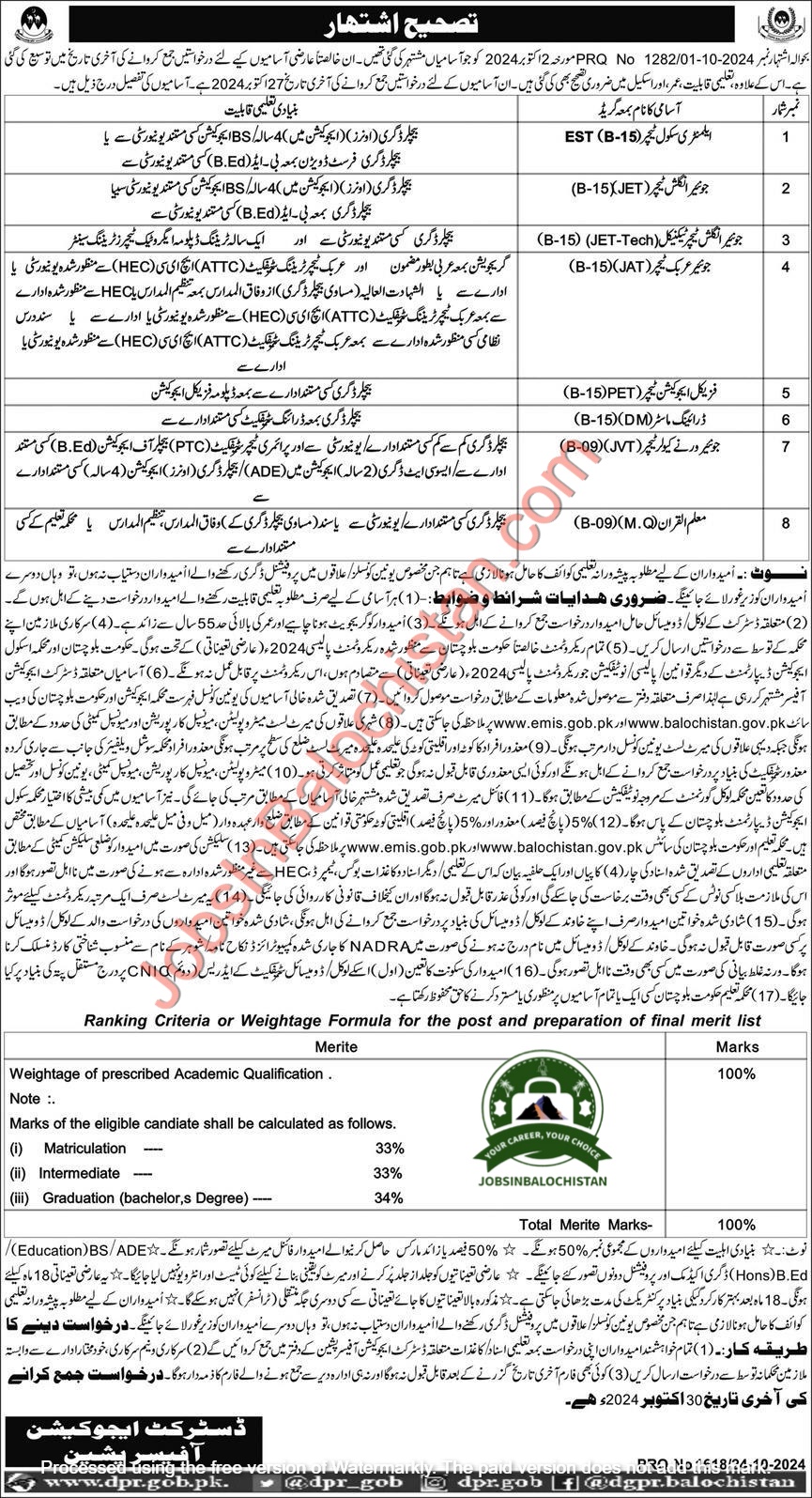 Submit applications along with all required documents to the District Education Officer, Pishin, by 30 October 2024.
